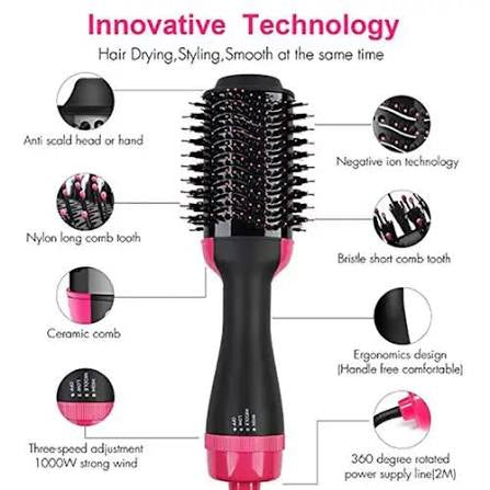 The same Brush designed with Nylon Pin & Tufted Bristles for detangling, improved volume and control. Unique Oval Brush Design for Smoothing the Hair, while the Round Edges Create Volume. 1100-Watt power provides just the right heat. Unlike conventional hair dryers, this volumizer can be placed closer to the scalp for lift. 3 Heat/Speed Settings for Styling Flexibility